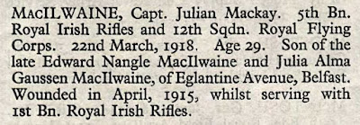 Captain Julian M MacIlwaine was killed in action on 22nd March 1918.